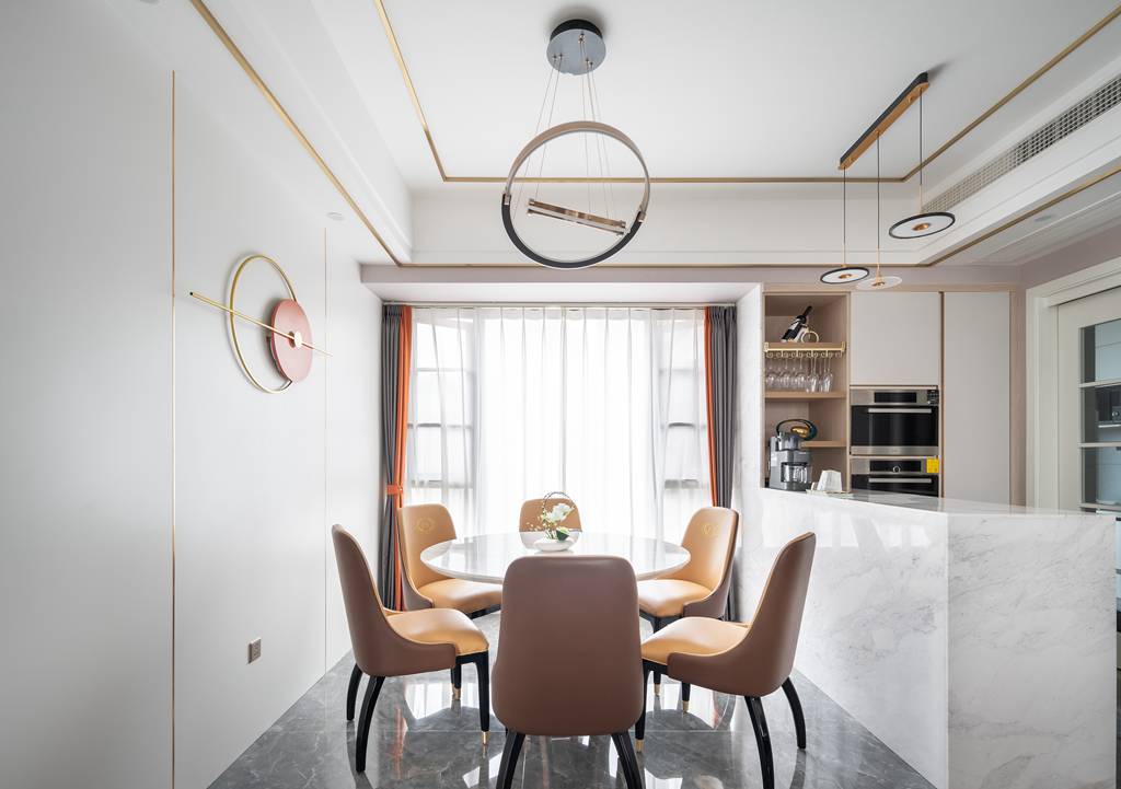 客厅空间整体以白色为主,橙色点缀其中,为空间注入活力与温度。业主喜欢轻奢质感,所以在墙面上、顶部、柜体上都有嵌入金属线条,表现出前卫的空间张力。由于原始空间沙发背后较空旷,设计师特根据业主日常喜好与后面增加休闲区,用于摆放钢琴与按摩椅,无于形中为空间带来艺术氛围。