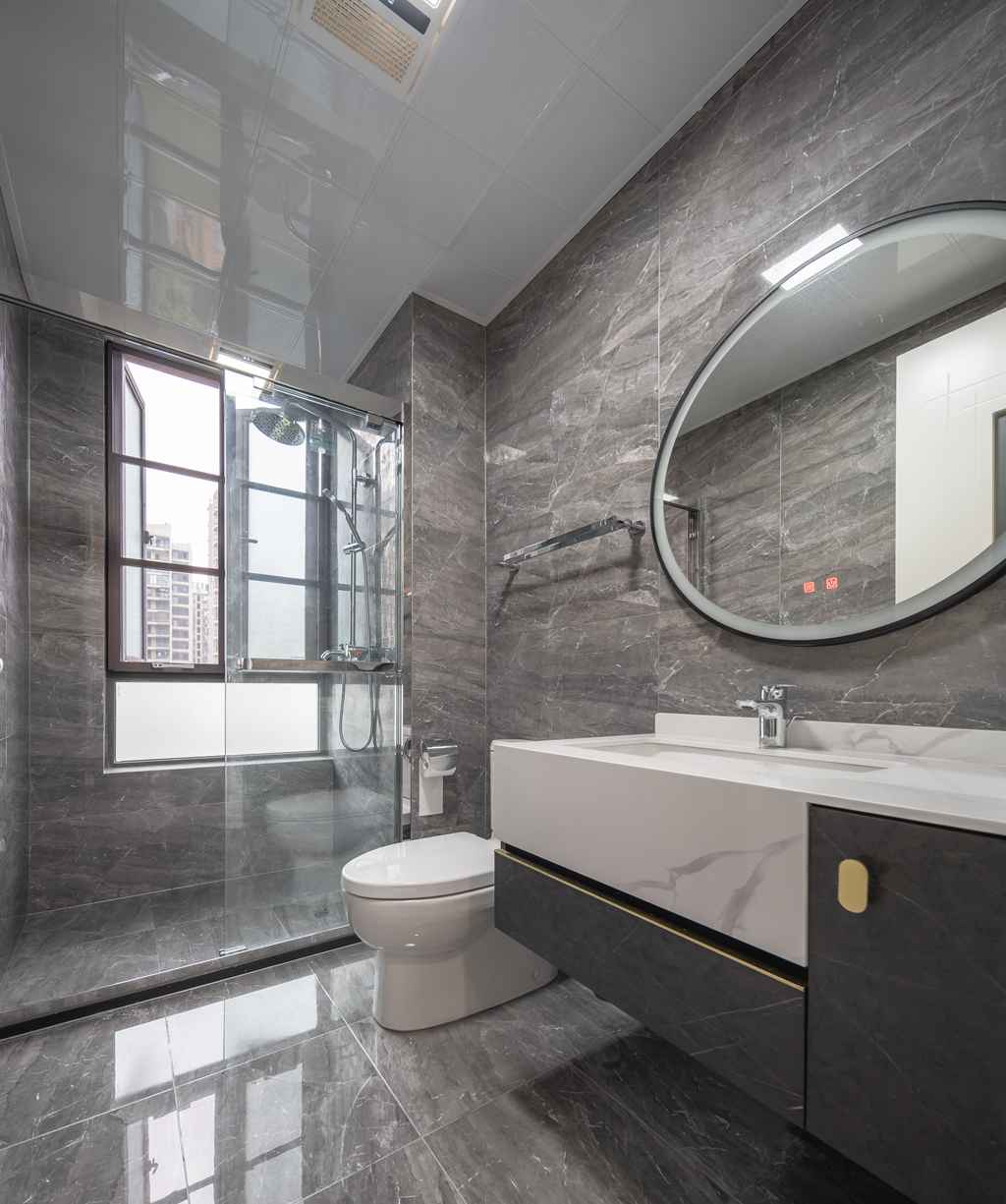 圆形金属灯具释放优雅韵味,也赋予了生活的仪式感。爱马仕橙色皮质沙发呈一定弧度落于客厅中央,将家人之间温馨聚拢,灰白抱枕进行跳色,形成丰富的视觉感官。