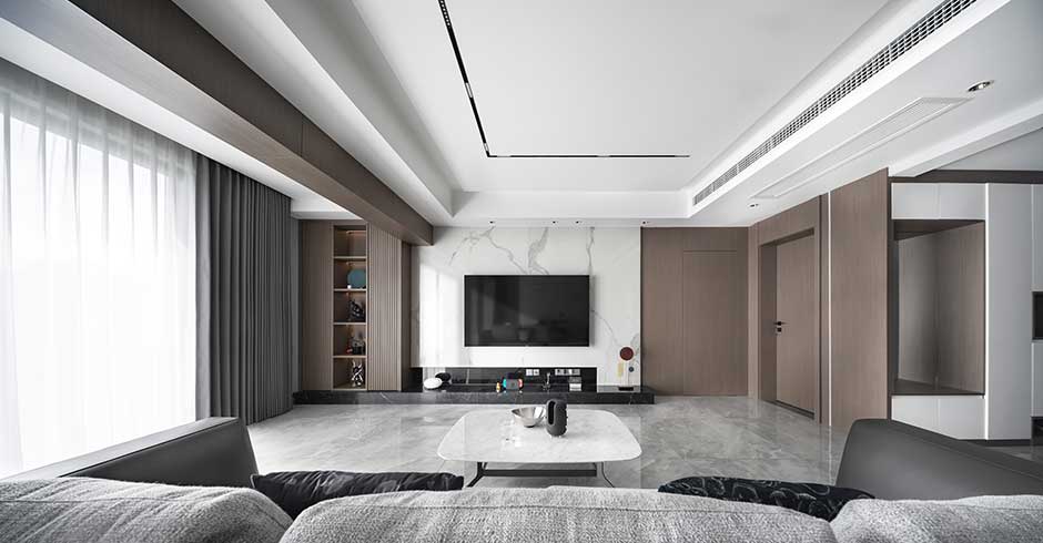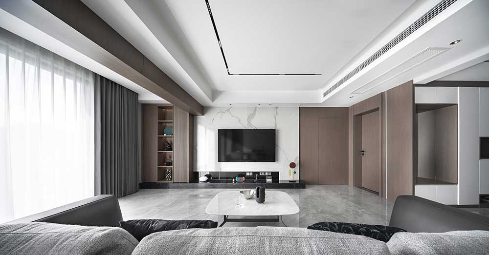 设计摄取“木”的力量与美,大面积铺设温润木饰面,作为表述现代自然的人居美学,恰如亚瑟·叔本华所说的,按照自然所启示的经验来生活。电视背景墙的米白色纹路大理石提供整面的宁静,视线落点上大面积的留白,构建起宽境大平层内全新的平衡感。