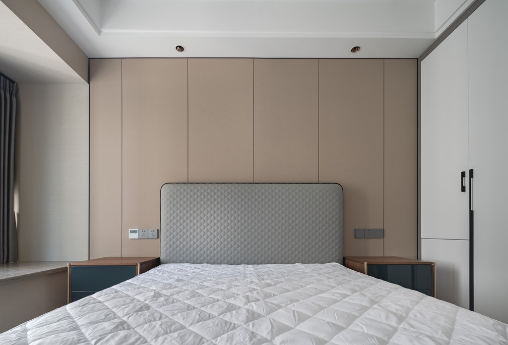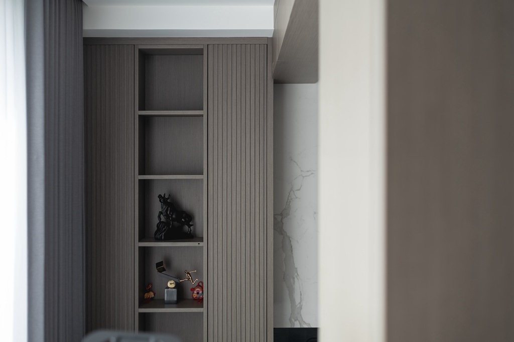 利用隐形门的处理予主卧绝对的私密,回归安静又充满质感的睡眠空间,让日常起居成为一种享受。床头背景墙以条状形式上下延伸,形成无限张力。