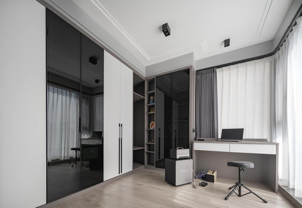 书房以收纳、办公为主,满足业主日常所需。柜体以黑色玻璃+白色门板+开放式存在,丰富空间形式,同时可有效避免压迫感。办公区临窗而设,视野开阔。