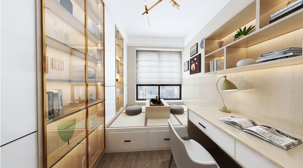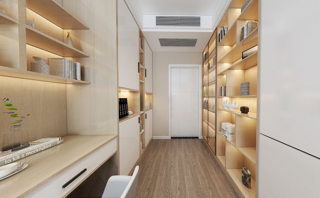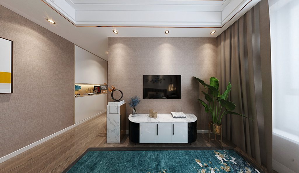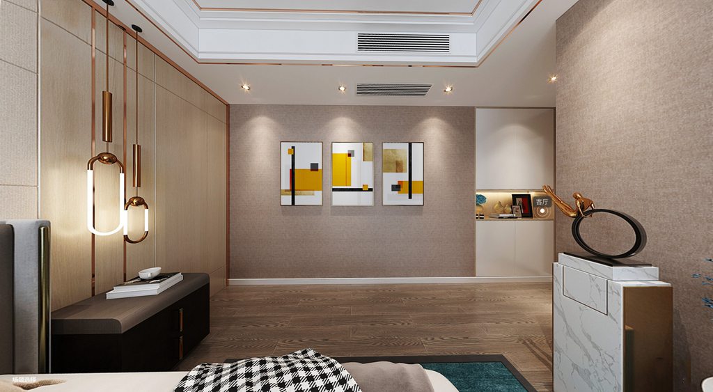 客厅与通往卧室的走廊之间由一面隔而不断的墙体来满足个性化打造。一席升降幕布缓缓落下,家庭影院即刻生成,无需之时便一键收起。墙上的抽象画引发无限的观想,仿佛表达了层峦叠嶂、四季交替、细水潺潺的山海自然景象,那被隐藏的无穷细节,又若时光流逝中的微妙嬗变,形成了艺术的诗意建构,让人淡淡的柔情在这场诗意中漾开。