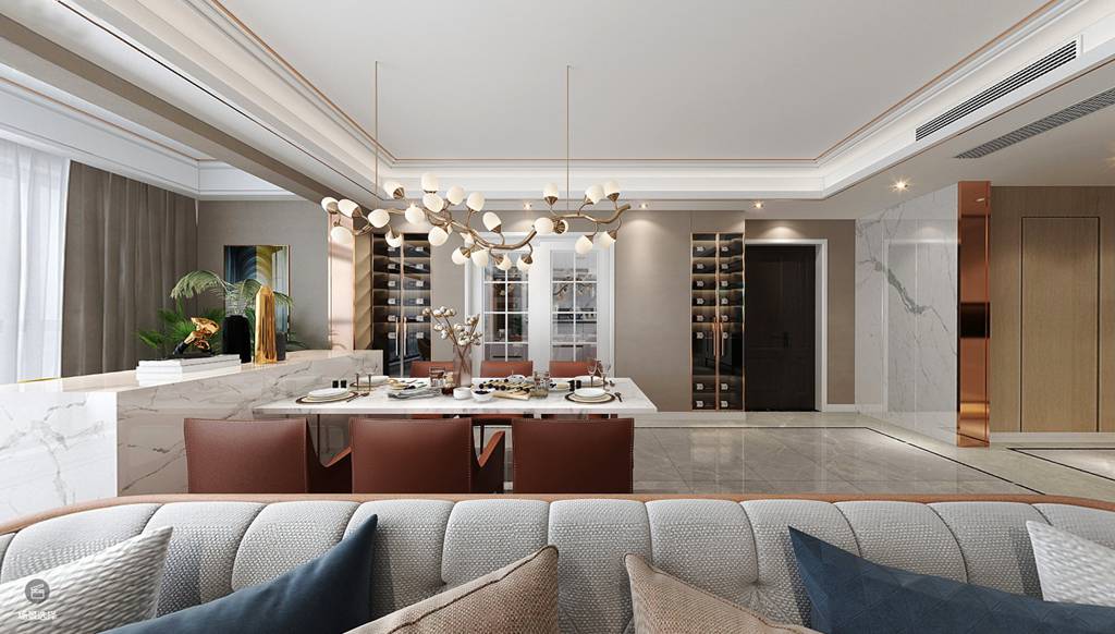 个性吊灯如同果实一般爬满整根藤条,金属色的外表,简洁的线条,充满着流动感。白色大理石餐桌搭配皮质餐椅,轻奢时尚,尽显高级感,一丝一毫之间无不彰显着主人浪漫主义情怀。餐桌与岛台相连,为生活提供了充足的互动空间。夜晚时点上灯光摇曳的蜡烛,再和爱人细细品味一瓶红酒,让心情也在这里随之放松。