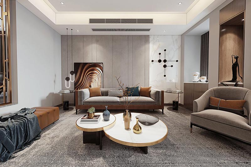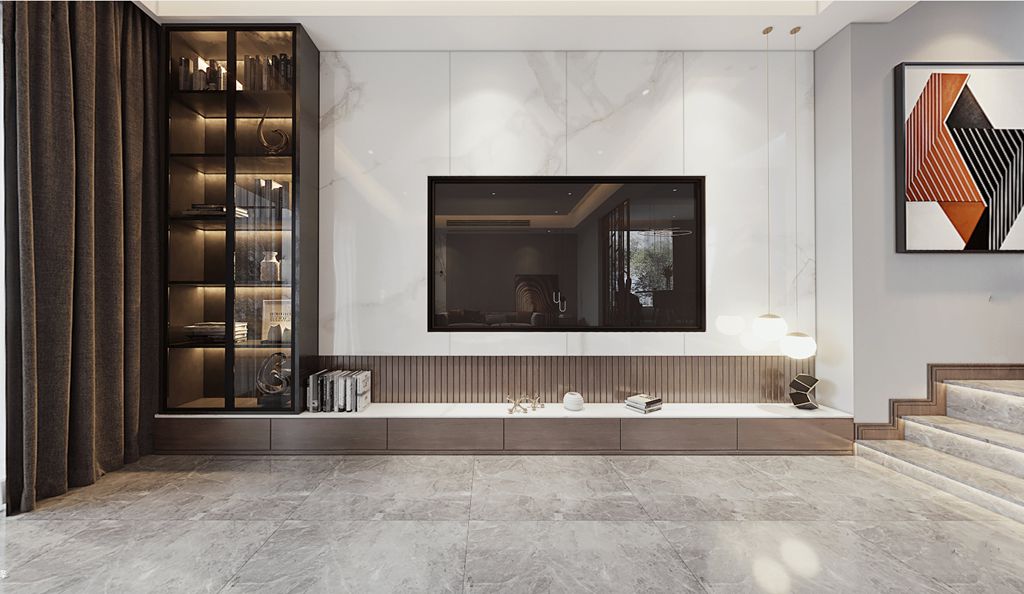 爵士白大理石电视墙简约肃静,加大储物与展示功能的同时,以块面和共通的材质延续整体风格,为整个空间打造一种自然的基底效果。