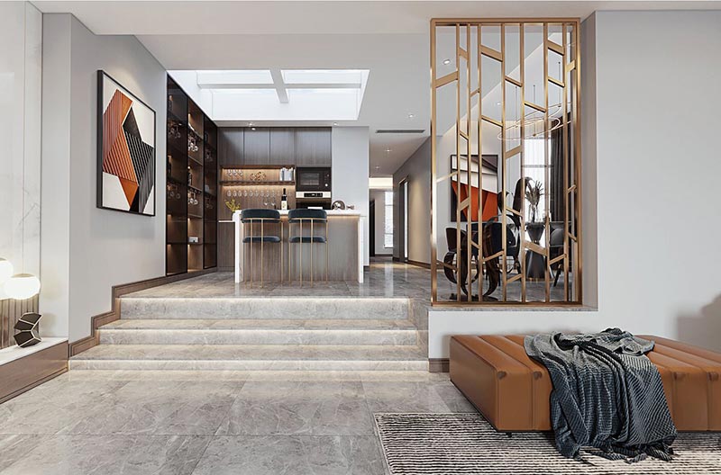 金属隔栅的加入为家装带来新意,实现区隔却穿透的效果。西厨酒柜的规划当中充分考虑造型的实用性,通过灯光氛围的优化处理,让整个酒柜体现出时尚感,内嵌蒸箱、烤箱满足业主多样化烹饪喜好,设计定制的岛台功能也十分强大,家人闲坐,朋友轰趴,亲子空间,一人独处。想要的生活状态都可以有。天井设计更是有着锦上添花之意,充沛的阳光和晨昏日暮伴随着四时之景,营造豪宅级的景观体验。