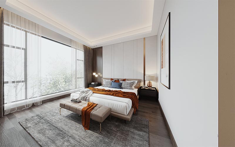 主卧安逸而舒适的铺陈,似乎在强调空间的睡眠属性,呈现出迷人的调性,没有过多冗余和浪费的设计语句,一切都是干脆利落的。