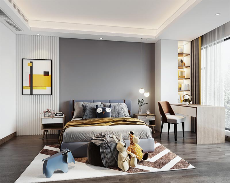 小小的儿童房中,可容纳孩子心目中最为憧憬的童梦世界,地毯的柔软、玩偶的陪伴......设计以温暖的手法触碰孩童内心深处的渴望,令每个日常都饱含生机。背景以灰色为主,与白色隔栅拼接,整个空间显得更加大气个性,一侧做书桌和书柜,使玩耍、学习、睡觉都可在同一空间中完成,给予孩子最大的尊重与保护。