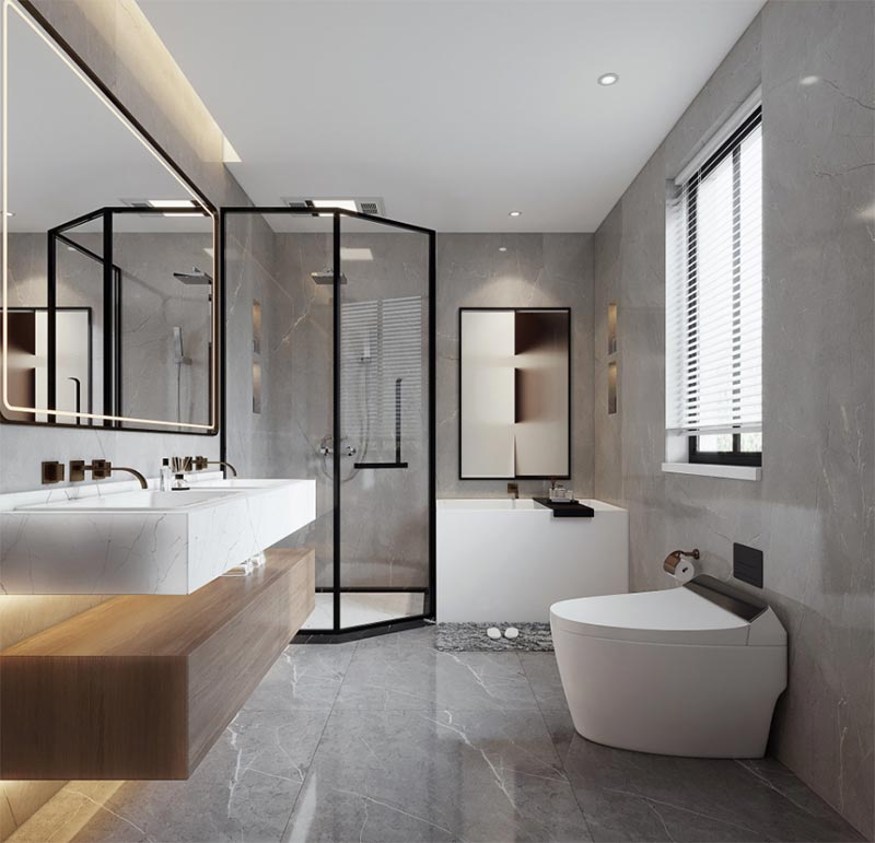 大理石自然简洁的质感,使卫生间整个空间显得更加明亮,搭配黑框玻璃淋浴房、暗装金属水龙头、悬挂式浴室柜不仅彰显了一种美好、精致的生活态度,还透露出主人不俗的品味。