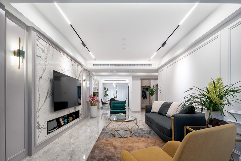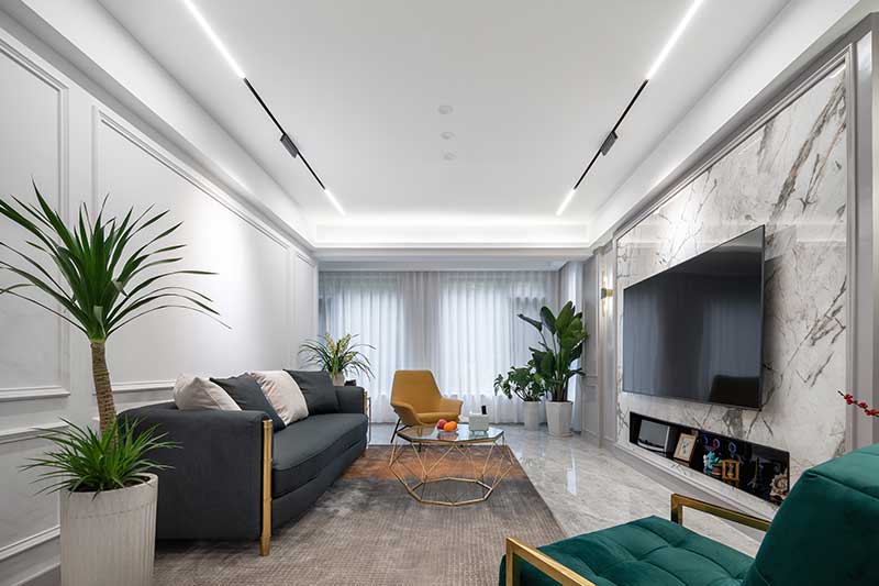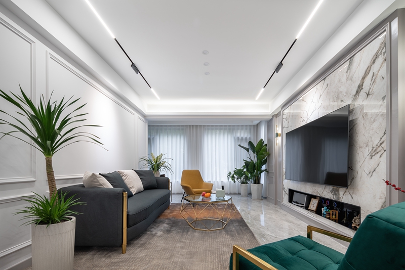 无主灯设计干净利落,并采用磁吸灯、壁灯来营造空间氛围感。电视墙整体做对称式凹凸设计,形成一种充满韵律的起伏感,与沙发背景墙相呼应,让整个客厅更有层次的同时,丰富视觉感官。