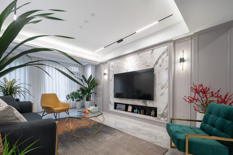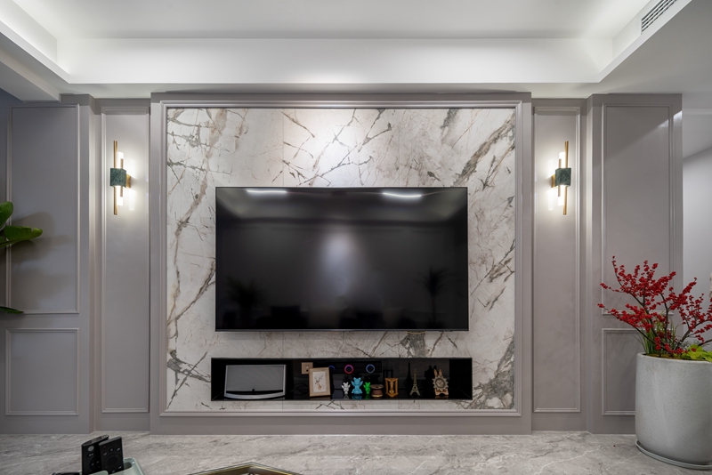 飘逸的墨迹以现代艺术手法渲染出大理石温润如玉的质地,辗转起伏,蜿蜒蔓延,留白的余韵浸透了居者的思绪。于电视下方做黑色嵌入式设计,代替电视柜的功能,兼具收纳与展示作用。