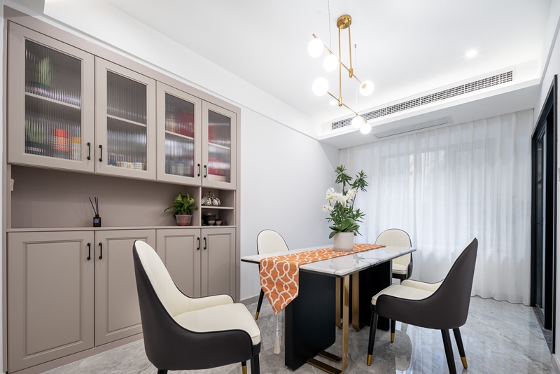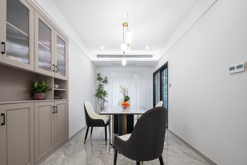 用咖色边柜为背景衬托出餐厅就餐的仪式感,在吊柜中采用长虹玻璃以若隐若现的高级姿态来完成空间的轻盈时尚。金属球形吊灯现代感十足,大理石餐桌与黑白色皮质座椅的搭配令空间更显大气精致。