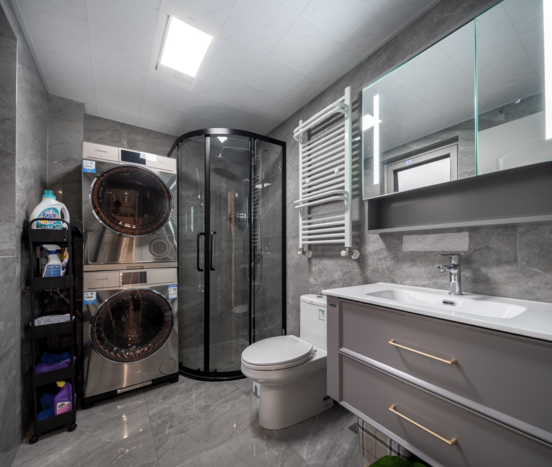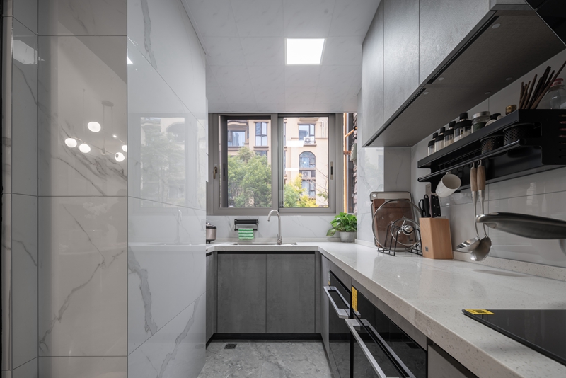 厨房回归设计美学初衷,用白色墙面与深灰橱柜形成对比,碰撞出一种别致的秩序感,时刻提醒着生活的舒适性和功能性。柜体全部采用按压式设计,与嵌入式电器形成统一,还原视觉清爽,更显整洁。