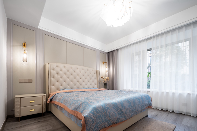 高级的空间感受来自于独白。主卧以白为主色调,床头背景墙硬包设计搭配灯笼式壁灯让人眼前一亮,让人感受着卧室的独特慵懒。