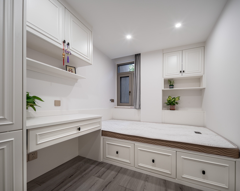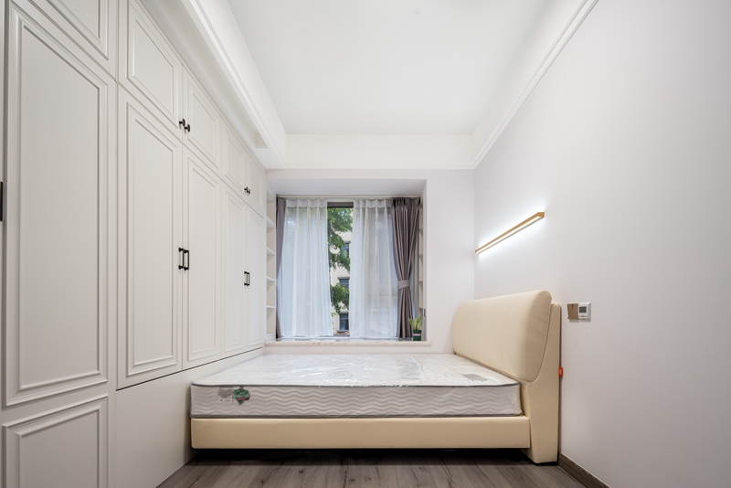 家里每一位成员,都值得享受生活的惬意。在满足大容纳收纳的前提下,空间主调仅仅使用了极其简单的材质和造型去表达空间“素”的特性,床头背景墙处设置金属线性灯,既不会过于扎眼,同时还能起到装饰作用。