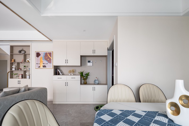 整个客餐厅以纯粹的白色调、浅米色为基底,同时点缀以雅致的大理石、轻奢金属组合,以丰富的肌理叠加,将精致时尚的都会风格延展开来,彰显着空间独特的仪式感。