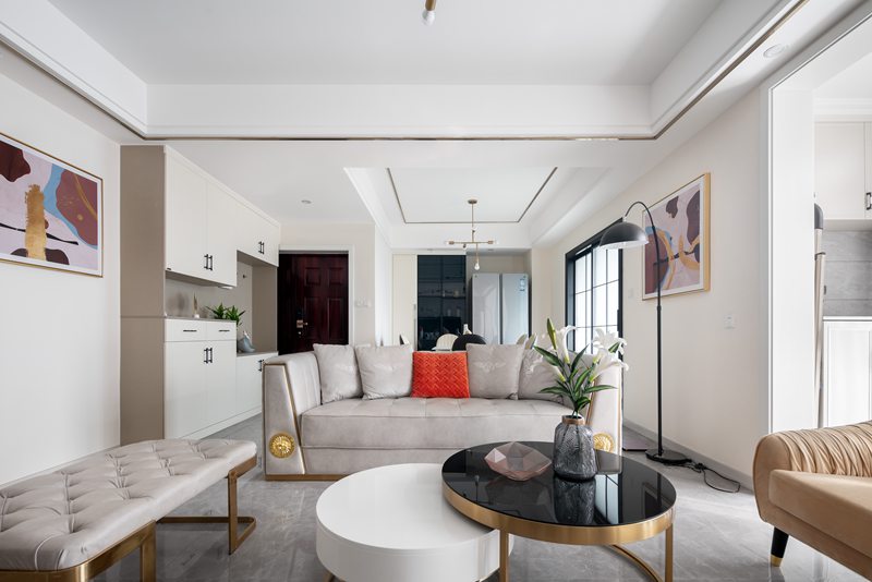 入户处定制到顶储物柜,并将动线和视线引导至客厅,其间部分采用开放式设计,用来摆放主人公喜爱的艺术摆件,增添空间趣味性,木饰面装饰,温润有力。